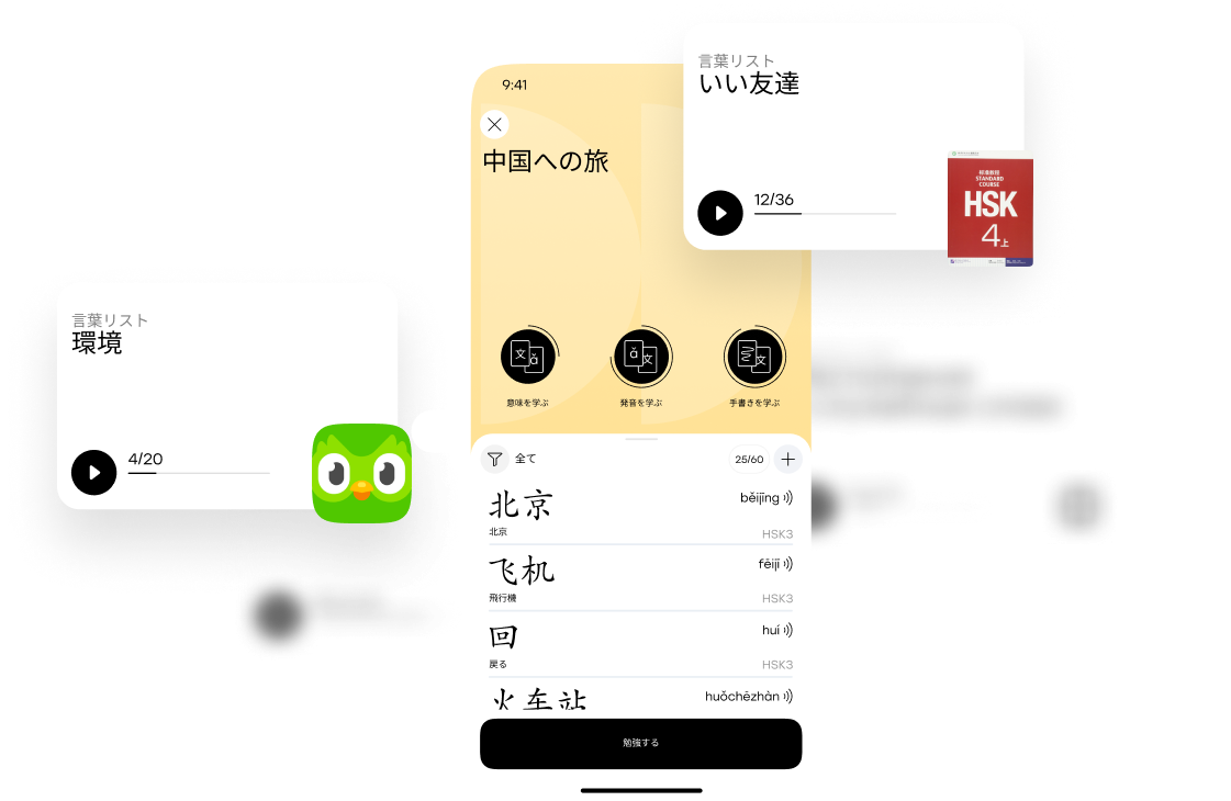 HSKレベルの単語リストや、人気のアプリや中国語教科書からの