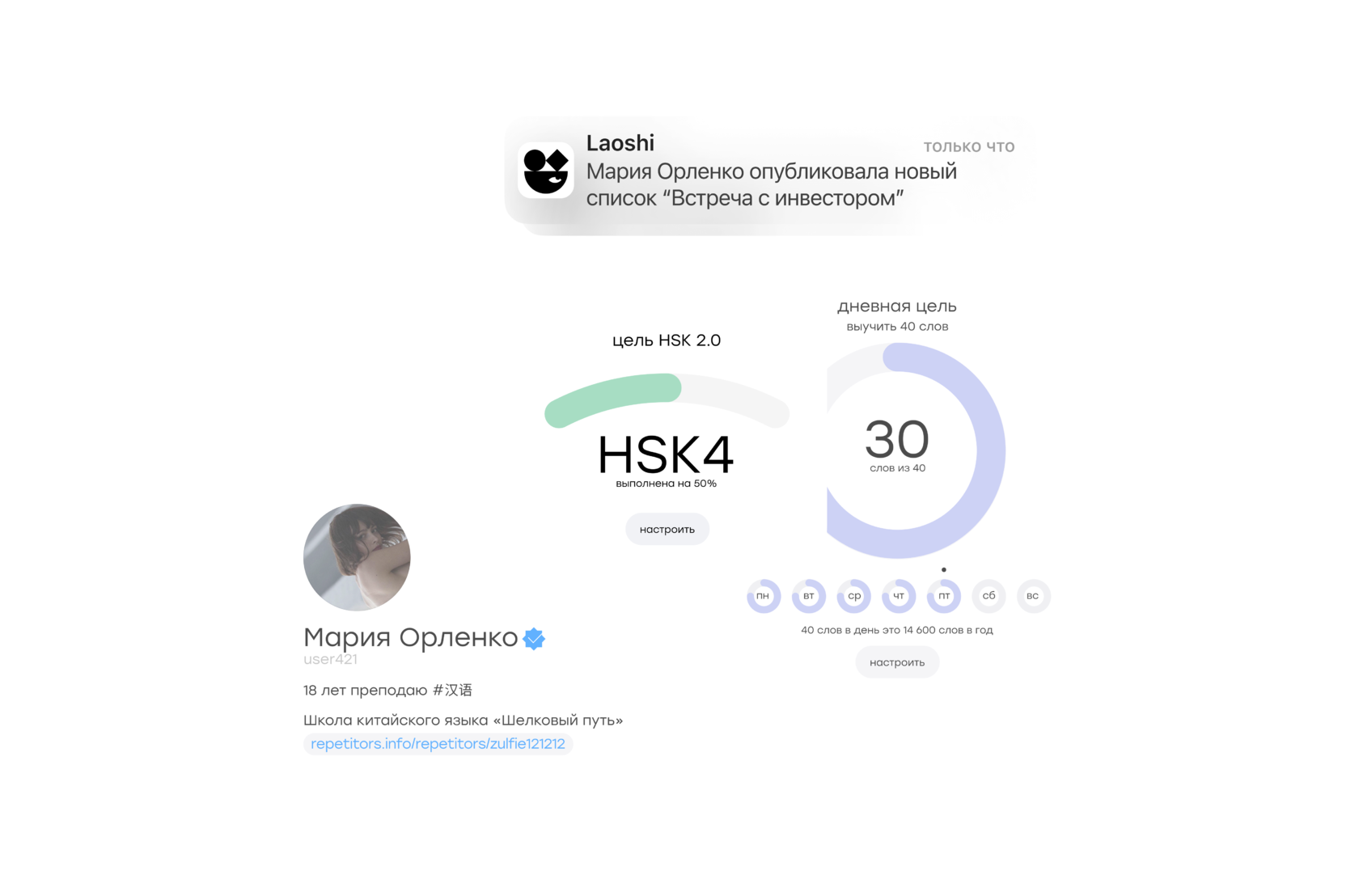 Ученики смогут подписаться на твой аккаунт в Laoshi и видеть новые подборки слов. Мы будем маркировать слова, которые студент выучил из твоего списка. Оставайся в его памяти на время всех циклов интервального повторения.